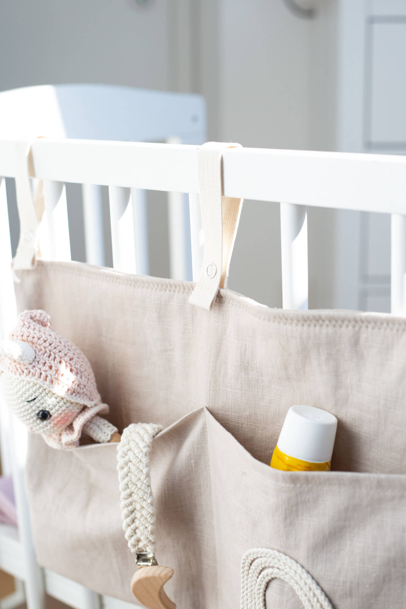 - Das Utensilo wird ganz einfach mit den Baumwollbändern und Druckknöpfen am Bett befestigt